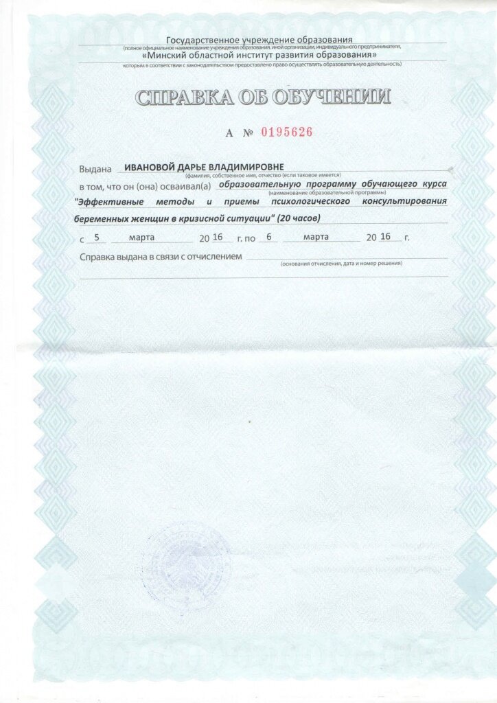 - ГУО «Минский областной институт развития образования» «Консультирование беременных женщин в кризисной ситуации: социальные, психологические и медицинские аспекты», «Эффективные методы и приемы психологического консультирования беременных женщин в кризисной ситуации».